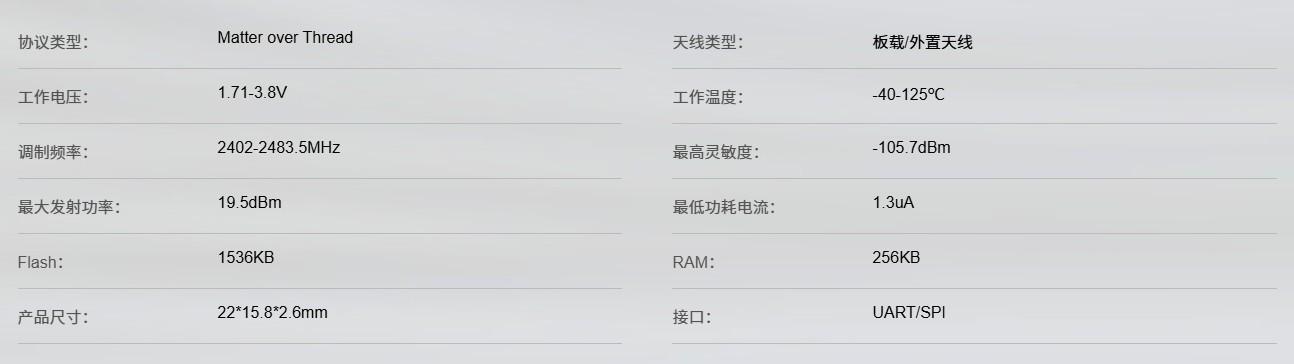 W-MT-37B是一款基于2.4 GHz频段的Matter over Thread无线通信模块。它包括一个高性能、高度集成的射频处理芯片,内嵌低功耗32位ARM® Cortex®-M33内核,1536kB Flash,256kB RAM,以及丰富的外设资源,搭载集成PCB天线和外置天线座,支持Matter、Thread、BLE 等无线通信技术,可用于开发Matter over Thread终端设备,将原有的无线设备轻松升级为满足Matter标准的智能家居设备。